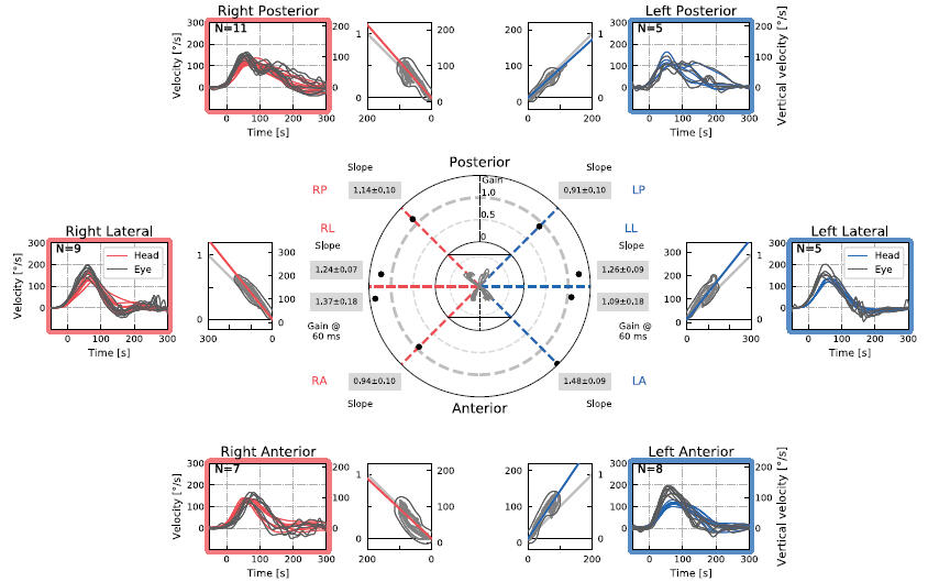 Video head impulse test (vHIT) Short rapid head movements are used to stimulate the inner ear semi-circular canals. Image above shows results from this test.